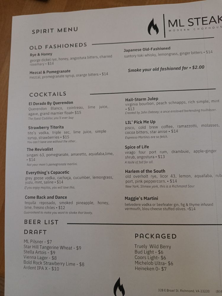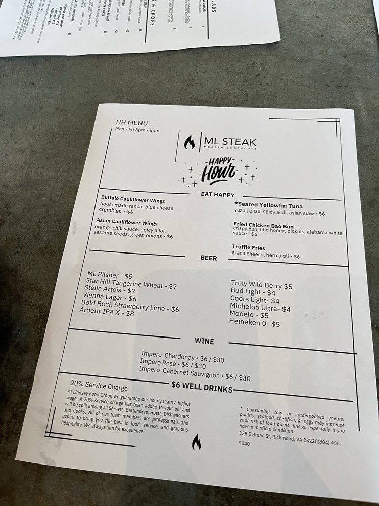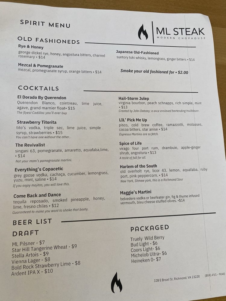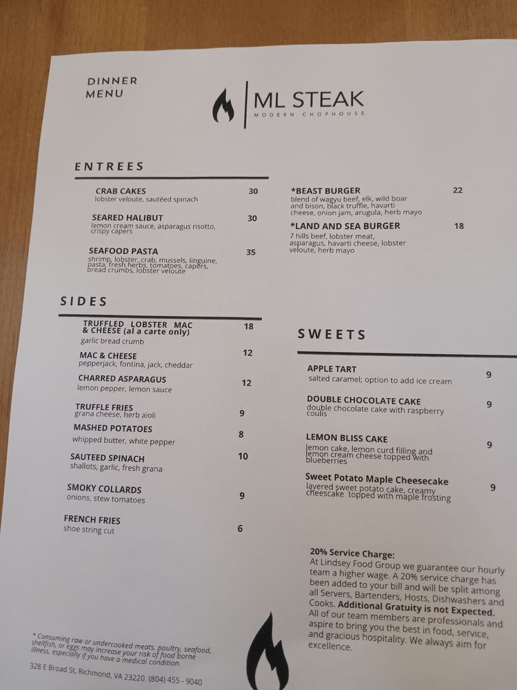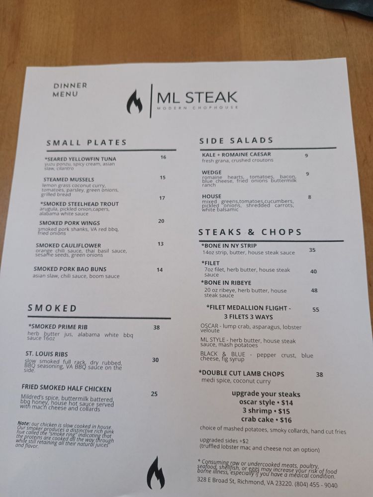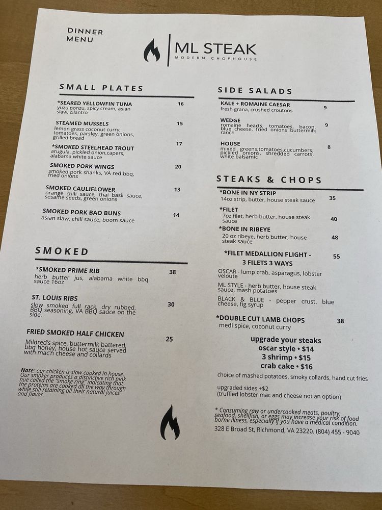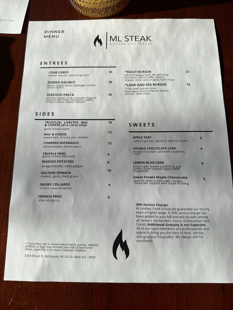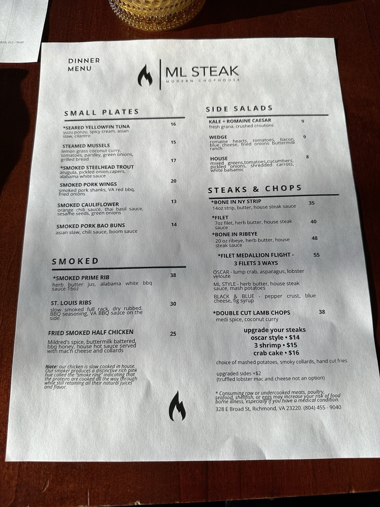 Introducing ML Steak, a culinary gem offering a mix of desserts, steakhouses, and seafood delights. Situated in the heart of Bon Air, VA, this restaurant boasts a cozy ambiance and attentive service. Customers rave about the delectable prime rib, perfectly cooked rack of lamb, and mouthwatering NY strip. The lobster mac and cheese is a must-try, while the smoked cauliflower and lamb chops leave taste buds tingling. Although some patrons wish for a more diverse menu, the overall dining experience at ML Steak is top-notch. With a focus on quality ingredients and impeccable presentation, this establishment is a go-to spot for those craving a satisfying meal in a welcoming setting. Plan your visit to ML Steak for a memorable dining experience that exceeds expectations.